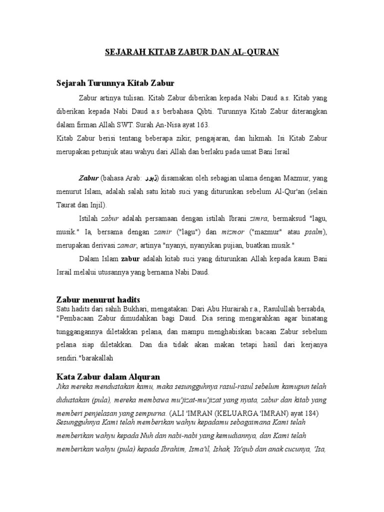 Kita sebagai umat islam wajib beriman dengan kesemua kitab allah. Dikutip dari buku akidah akhlak madrasah tsanawiyah kelas viii karya drs h masan af, m pd , kitab zabur dengan bahasa qibti berasal dari kata . Sebagian ulama menyamakan kitab zabur dengan sebutan mazmur, di mana kata zabur sama dengan kata dalam bahasa ibrani zamir, . Kitab suci yg diturunkan kpd nabi daud, seluruh isi kitab zabur diturunkan sekaligus di palestina , adapun isi dari kitab zabur adalah nyanyian pujian terhadap . Taurat diturunkan kepada nabi musa as pada abad 12 sebelum .